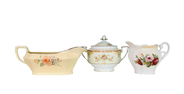 Description: Complement your mismatched table settings with assorted creamers, boats, and sugar containers. Use for coffee and tea station and/or on the tables for sauces and dressings. Specify China Girl, For You Blue, Gold Rush or Glass. Rented by the piece. Specify quantity desired.