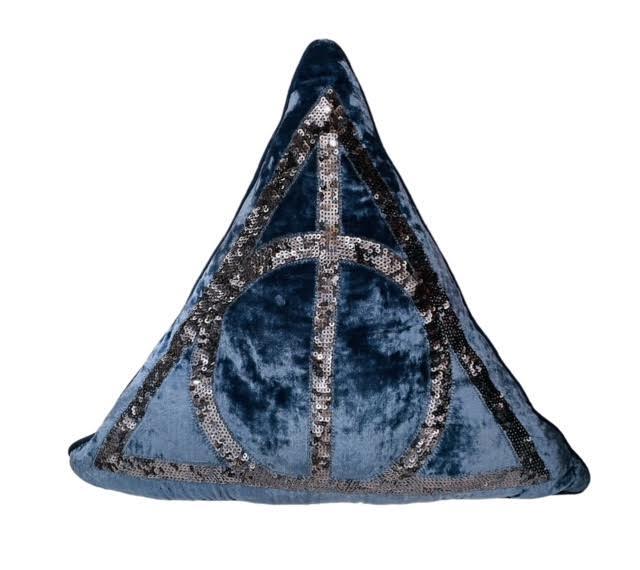 Description: A dark blue, velvet, triangular pillow with Deathly Hallows symbol from Harry Potter.
