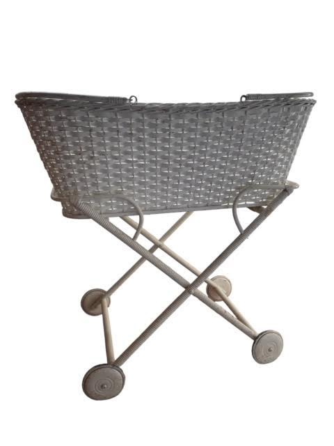 Description: A large, white basket bassinet on a stand with wheels. It's perfect for a baby shower wishing well or to prop up a nursey in a home staging project.