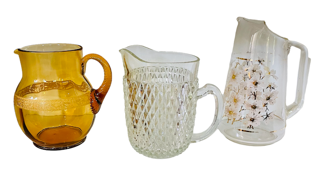 Description: Assorted glass, china, and ceramic/pottery pitchers. Use for water or as a floral vessel. Rented by the piece. Specify quantity desired.