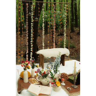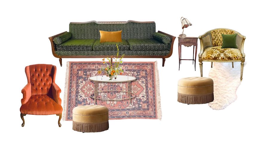 Description: A vintage lounge in earthy tones with pattern play, inspired by Carole King's Tapestry album. Lamp included. Flowers not included. For more patterns, add additional throw pillows!