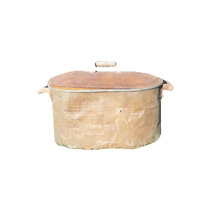 Description: A vintage copper tub that works well for bottled beverages, rolled up blankets for chilly nights, or flip flops for dancing feet. Use with or without its rusty lid.