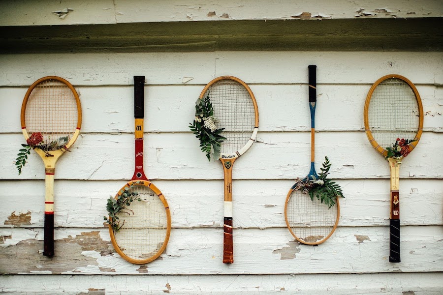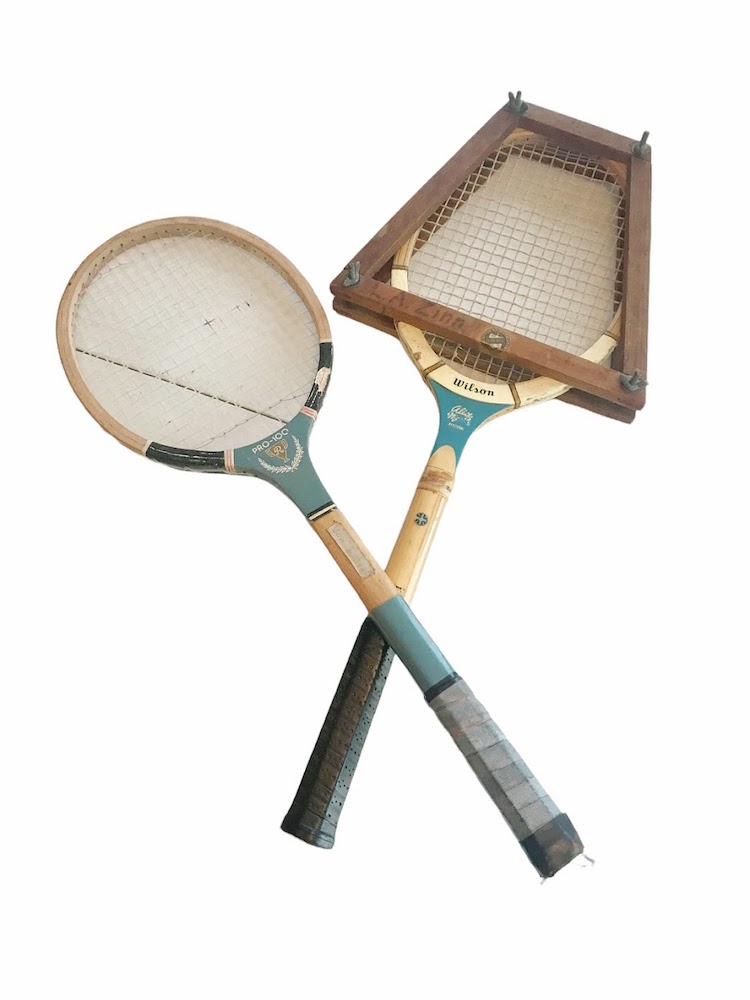 Description: Assorted vintage tennis rackets for vignettes, floral installations, or staging.
