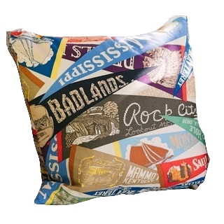 Description: A large, multi-colored throw pillow of USA and National Park pennants.