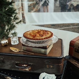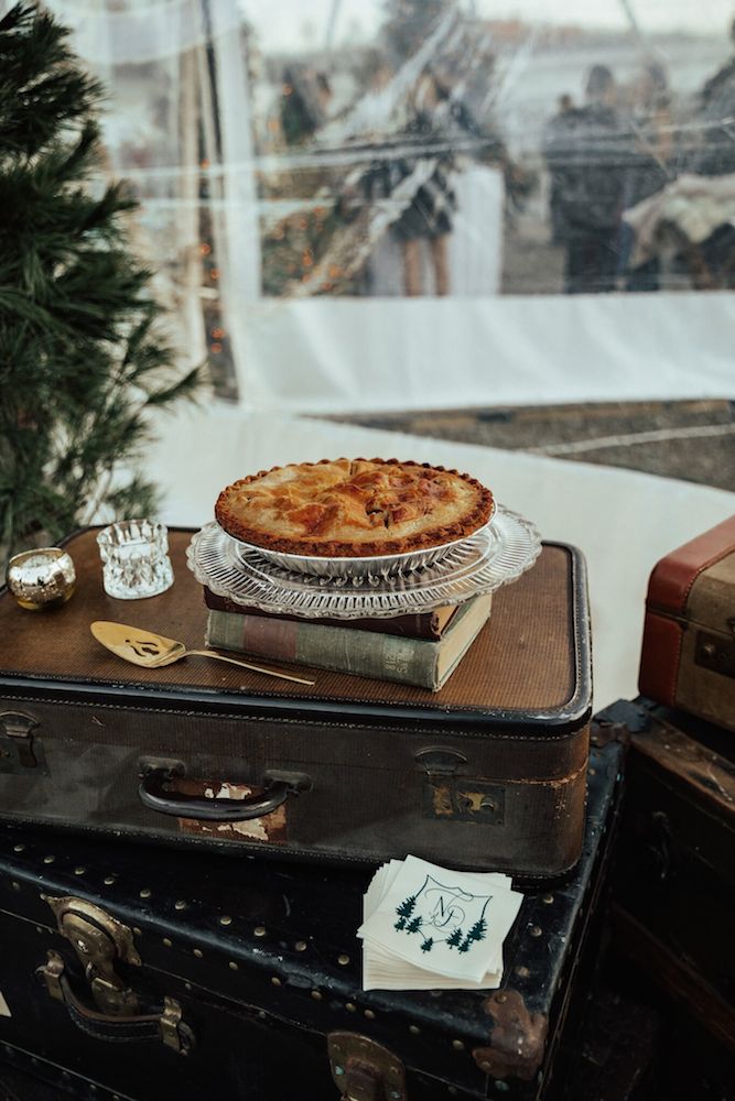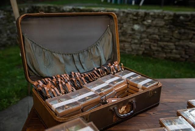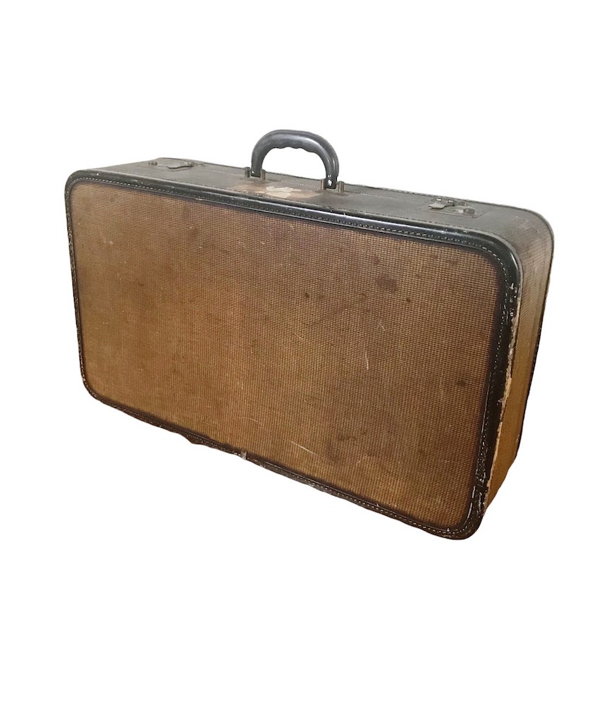 Description: A vintage brown suitcase. Consider it as a vessel to collect cards or display programs or favors. It can also prop up a lounge or coffee & tea display.