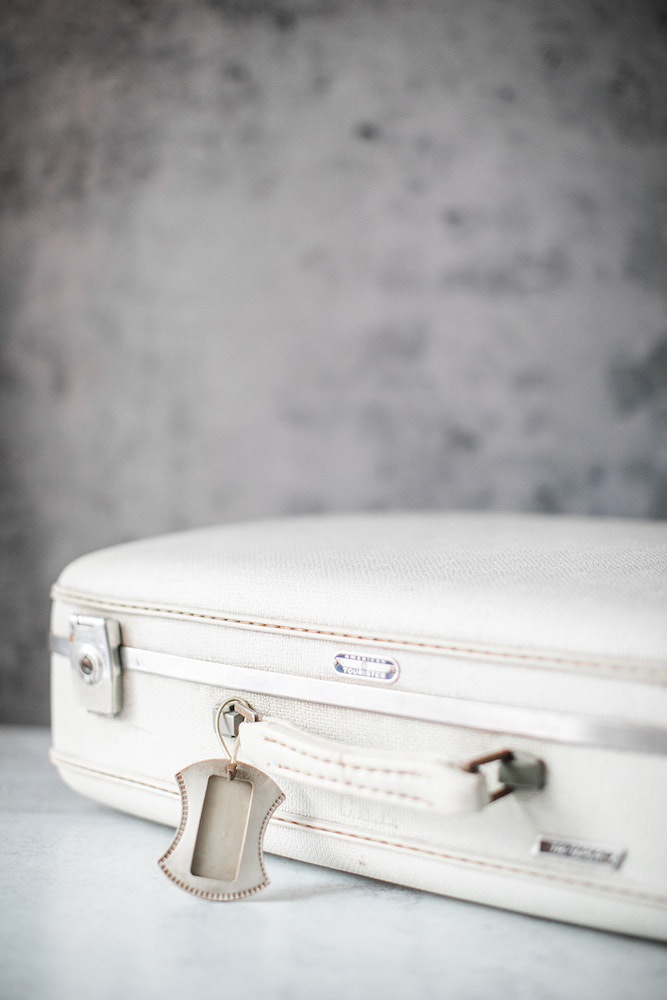 Description: A vintage white suitcase makes a great retro prop with several uses. Use it as a unique vessel to collect wedding cards or display programs.